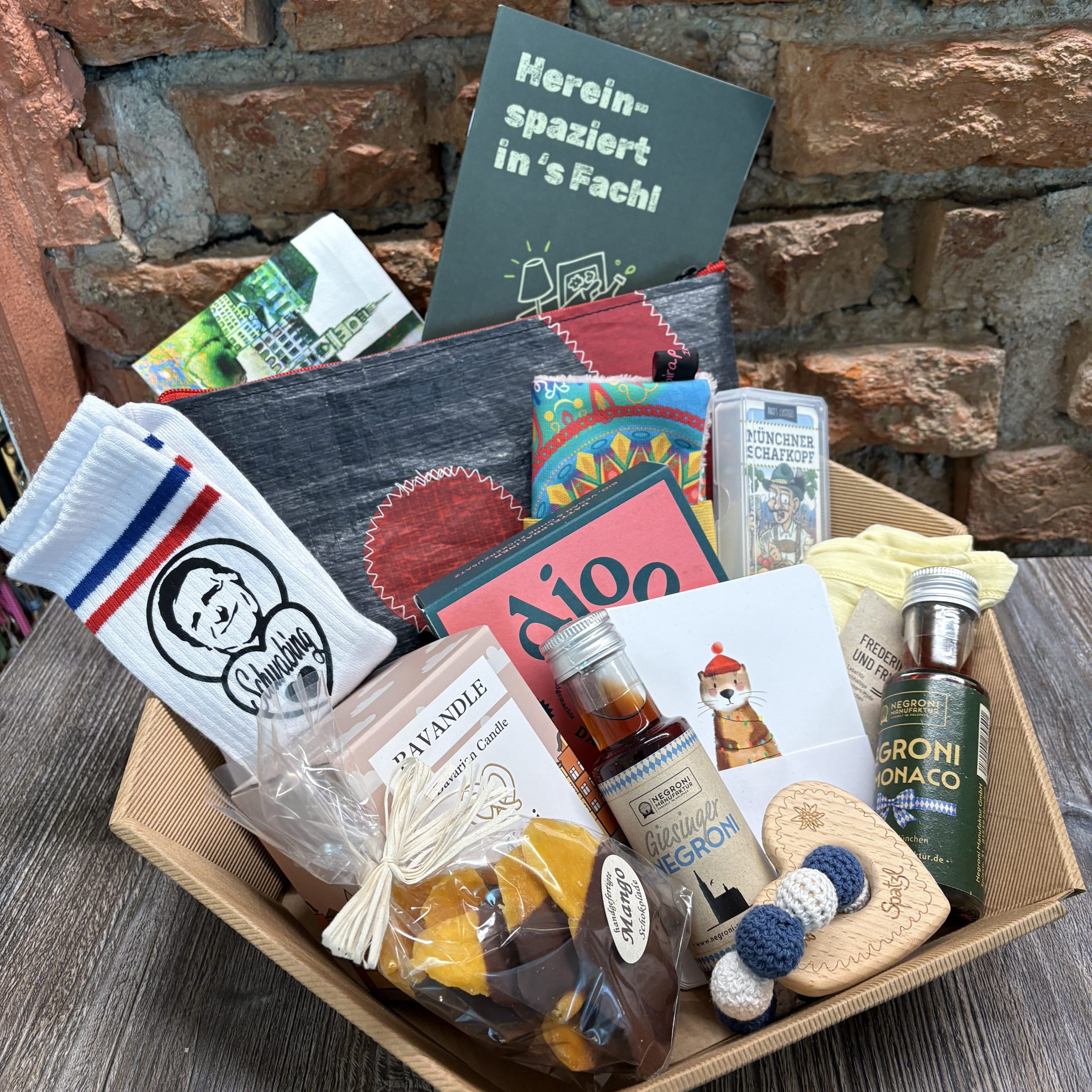 Gewinne einen Geschenkkorb mit Liebe hergestellter Produkte von Münchner Mietern – unter anderem Dattelpralinen von DJOON, Münchner Schafkopfdeck von ANDI PAPELITZKY, Negroni von der MÜNCHNER NEGRONI MANUFAKTUR, eine Segeltuchtasche von STARNBAG uvm.