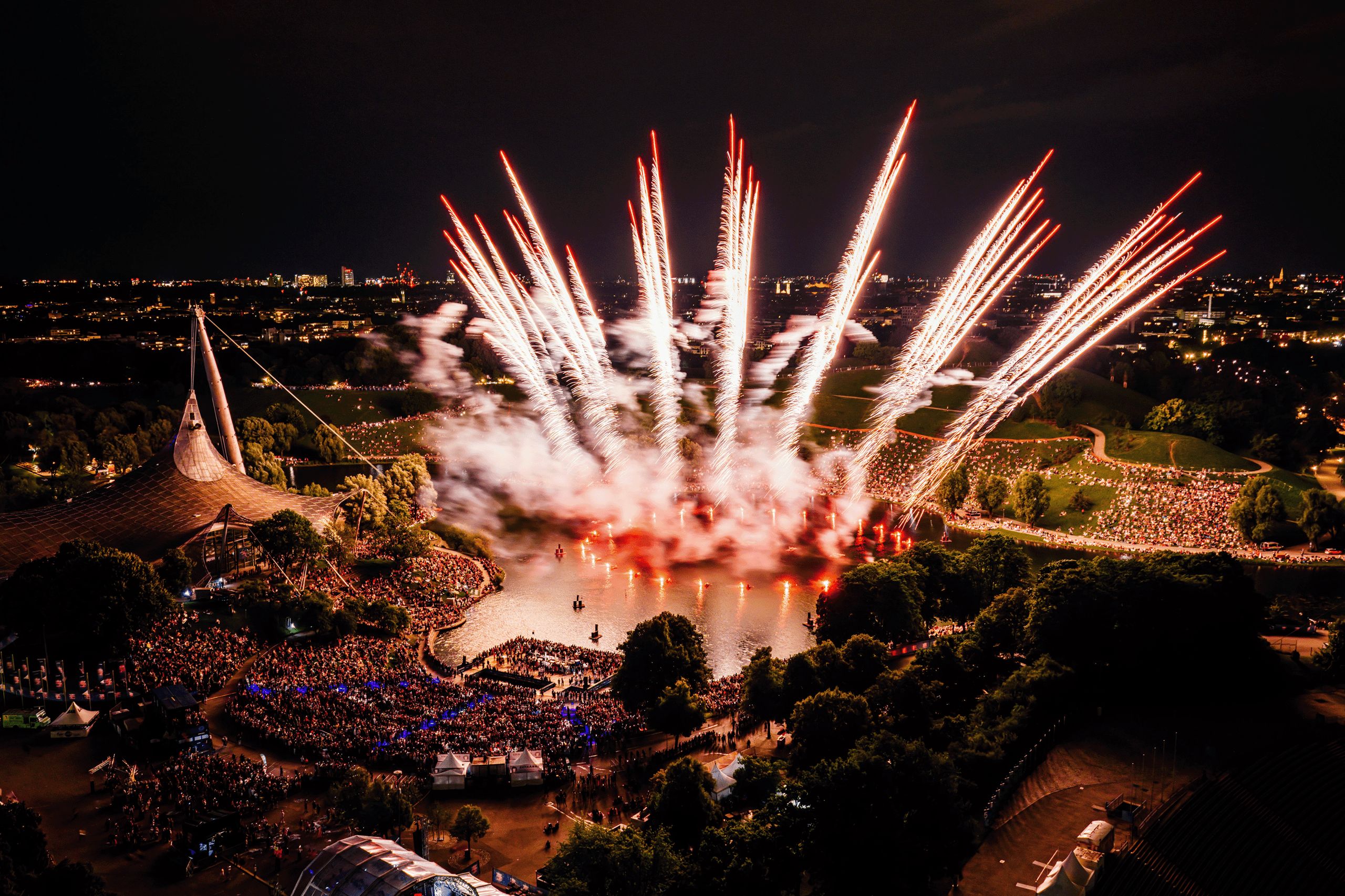 Der Höhepunkt des Abends? Eine der größten Pyroshows Deutschlands über dem Olympiasee, begleitet von mitreißender Musik und Gänsehaut pur!