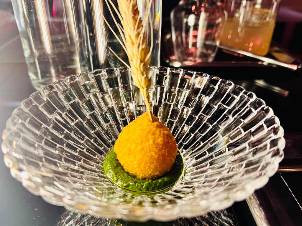 Unter „Latin Fire“ ging es weiter nach Südamerika, hier spielten bei kleinen Buchweizen-Quesadillas mit „Isarbazi“ von der Münchner Käsemanufaktur, Kakaobohne, grüne Tomate oder Coxinhas – kleine Bällchen mit niederbayerischem Land huhn, Ancho-Chili und der besten Chimichurri ever (aus Alpenkräutern!) – Röstaromen und Schärfe eine große olle. Mit „Nomadic Earth“ ging es dann umami-reich nach Afrika, ein Pilau aus Emmer, Chai, Kalbszunge und Stängelkohl begleitete ein Milchlamm (Polting) mit Cape-Malay-Curry. Zum Dessert mit „Bushland Essence“ ein Sprung nach Australien, hier sorgten kristallines und cremiges Eis aus Hagebutte und Bergamotte sowie eine Kreation aus Walnuss, Blaumohn und „Finger Lime“ (Limetten-Kaviar) für große Überraschungen.