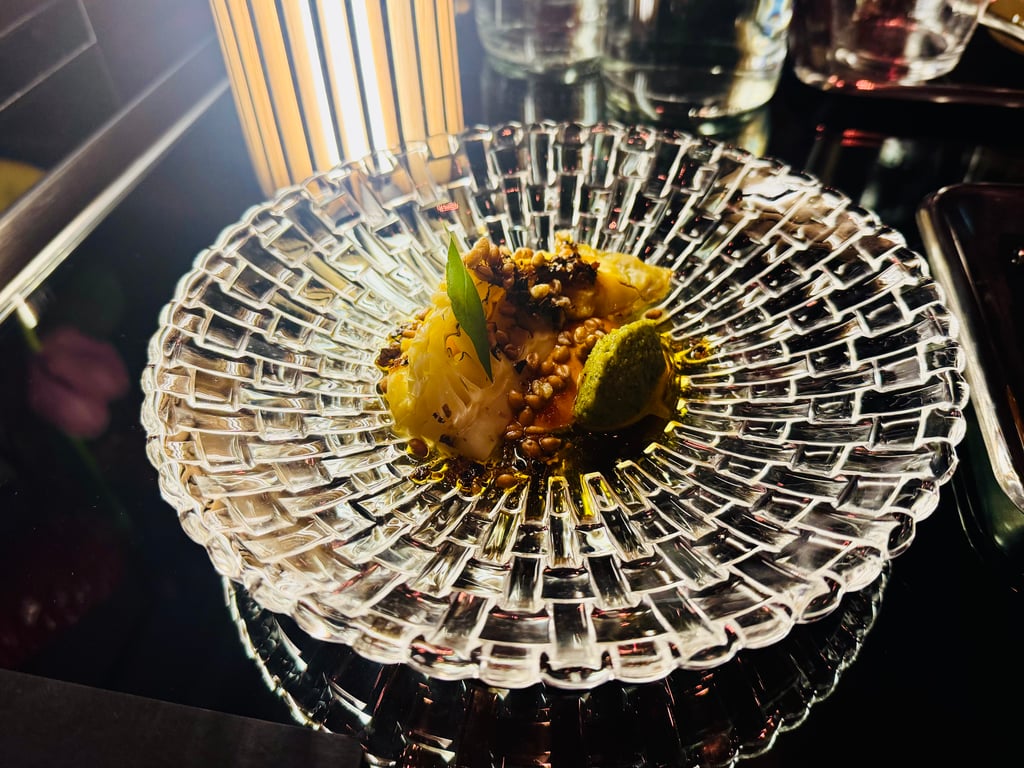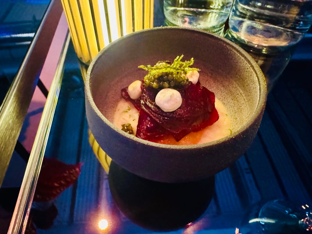 Im Gegensatz zum Konzept von „The Cloud“ – das sich im jährlichen Turnus, natürlich mit wechselnden Menüs, einer Küchenrichtung widmen wird – kommen die Pop-up-Gäste in den Genuss einer Weltreise: Los ging es mit „Baltic Purity“: Rauch, Salz und Fermentation waren die Grundlagen für kleine nordische Kunstwerke, die – wie praktisch alle Gerichte des Abends – intensive Geschmackserlebnisse auslösten, obwohl sie zunächst eher unspektakulär klingen: geräucherte Bachforelle mit ihrem Kaviar auf Roggenbrotscheibchen, ein Graupen-Risotto mit Rote Bete, Fichtennadeln, geräuchertem Schmand; Chiemsee-Renke als Tatar mit Schwarzem Rettich und Sauerampfer.