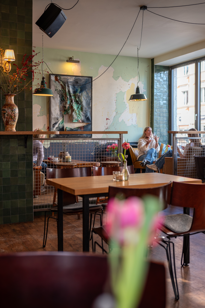 Ein Cappuccino kostet 3,50 €, ein Bier 2,80 €. Dazu gibt es kleine Snacks und hausgebackenes Bananenbrot. Und regelmäßig wird die Tagesbar zur Event-Location – von Day Drinking bis hin zu Single-Parties.