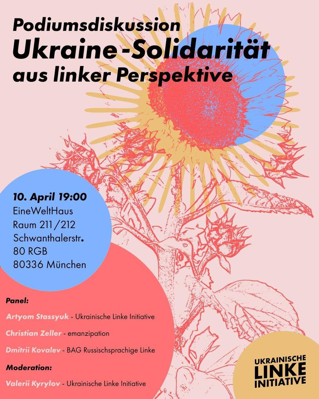 PodiumsdiskussionAm 10. April, um 19 Uhr, laden wir euch herzlich zu einer Podiumsdiskussion zum Thema Ukraine-Solidarität aus der linken Perspektive“ im EineWeltHaus, München ein!Gemeinsam mit ukrainischen, russischen und deutschen Panelist*innen werden wir über den aktuellen Stand des Krieges in der Ukraine diskutieren und erörtern, wie die deutsche Linke die Ukraine unterstützen kann.Die Diskussion wird von…