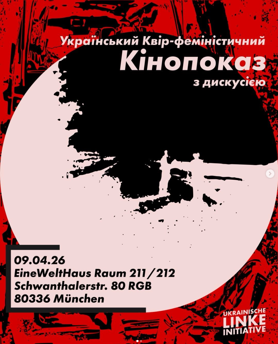Wir organisieren eine ukrainische queer-feministische Filmvorführung mit anschließender Diskussion!Teile den Beitrag gerne mit deinen ukrainischsprachigen Freund*innen in München💙💛Organisator: Ukrainische Linke Initiative (ULI)www.instagram.com/ukrainische_linke_initiative/Мюнхен! 9 квітня запрошуємо вас на показ двох короткометражних фільмів та подальшу дискусію – реєструйся за посиланням в біо🎞️Де? – EineWeltHaus (Schwanthalerstraße 80, 80336)Коли? – 09.04 (четвер), 19:00Які фільми? – «Жінки на війні: Історія…