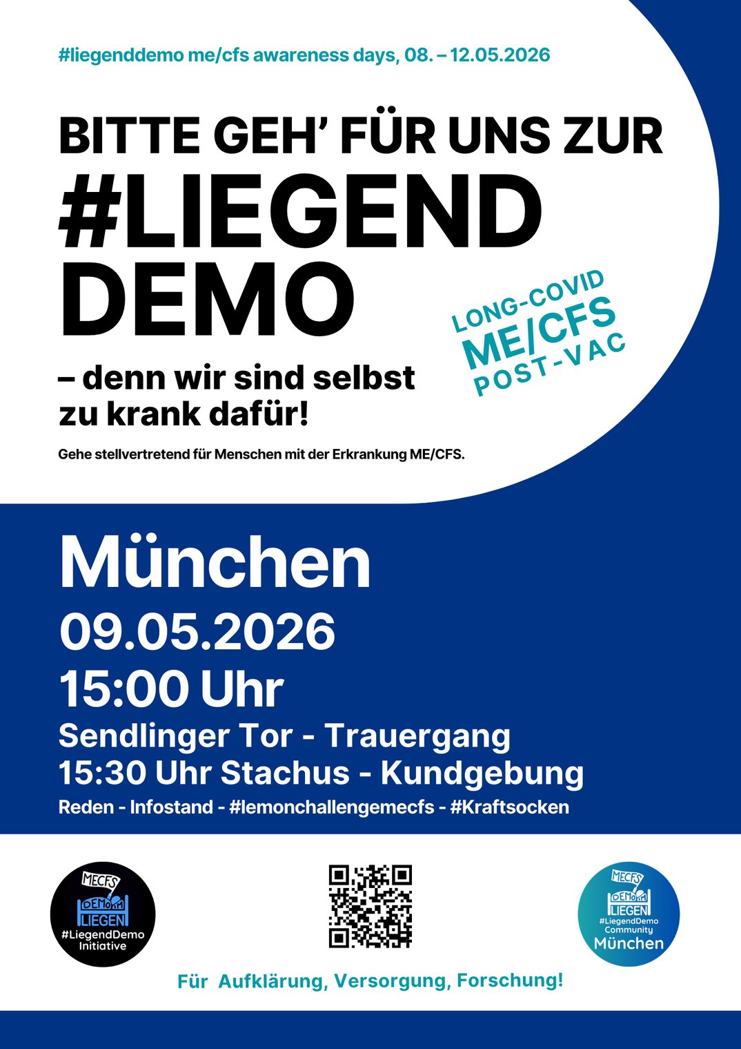Im Rahmen der internationalen ME/CFS Awareness Days findet in München eine sogenannte „LiegendDemo“ statt. Die Demonstration macht auf die schwere und häufig unsichtbare Erkrankung Myalgische Enzephalomyelitis/Chronisches Fatigue-Syndrom (ME/CFS) sowie auf Long-COVID und Post-Vac-Syndrome aufmerksam.Viele Betroffene sind so schwer erkrankt, dass sie ihr Zuhause oder sogar ihr Bett nicht mehr verlassen können. Bei der LiegendDemo legen…