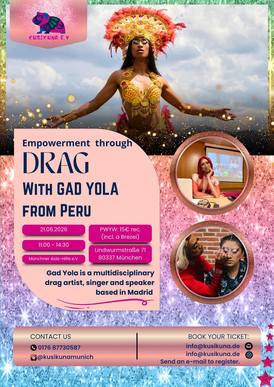 Workshop mit Gad Yola aus PeruErlebe einen inspirierenden und kreativen Workshop mit der peruanischen Drag-Künstlerin Gad Yola. In diesem Workshop entdecken wir gemeinsam, wie Drag als kraftvolles Mittel zur Selbstermächtigung, zum kreativen Ausdruck und zur persönlichen Entfaltung genutzt werden kann.Die Teilnehmenden lernen die Grundlagen der Drag-Kunst kennen – von Make-up-Techniken über Performance bis hin zur…