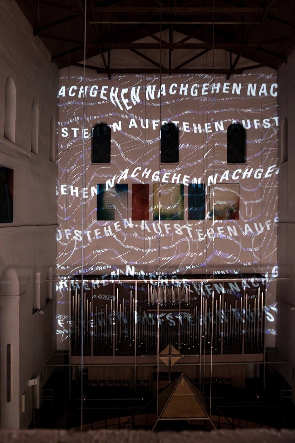 Als Textmaterial nutzen sie Schlüsselbegriffe aus dem neu erschienenen Buch „Suche Frieden und jage ihm nach: Die Botschaft des heiligen Benedikt für heute“ von Abt Johannes Eckert, in der er sich mit der mehr als 1.500 Jahre alten Regel des Hl. Benedikt auseinandersetzt, die die Basis für ein gelingendes Zusammenleben in Frieden legt. Begriffe wie Umdenken, Standhalten, Dienen, vor allem aber auch Maßhalten und Anfangen werden typografisch modifiziert und in den Kirchenraum geschrieben. Aus Klang, Licht und Schrift entsteht ein meditativer Raum, die die Besucherinnen und Besucher einlädt, mit allen Sinnen „Frieden zu suchen und ihm nachzujagen“.