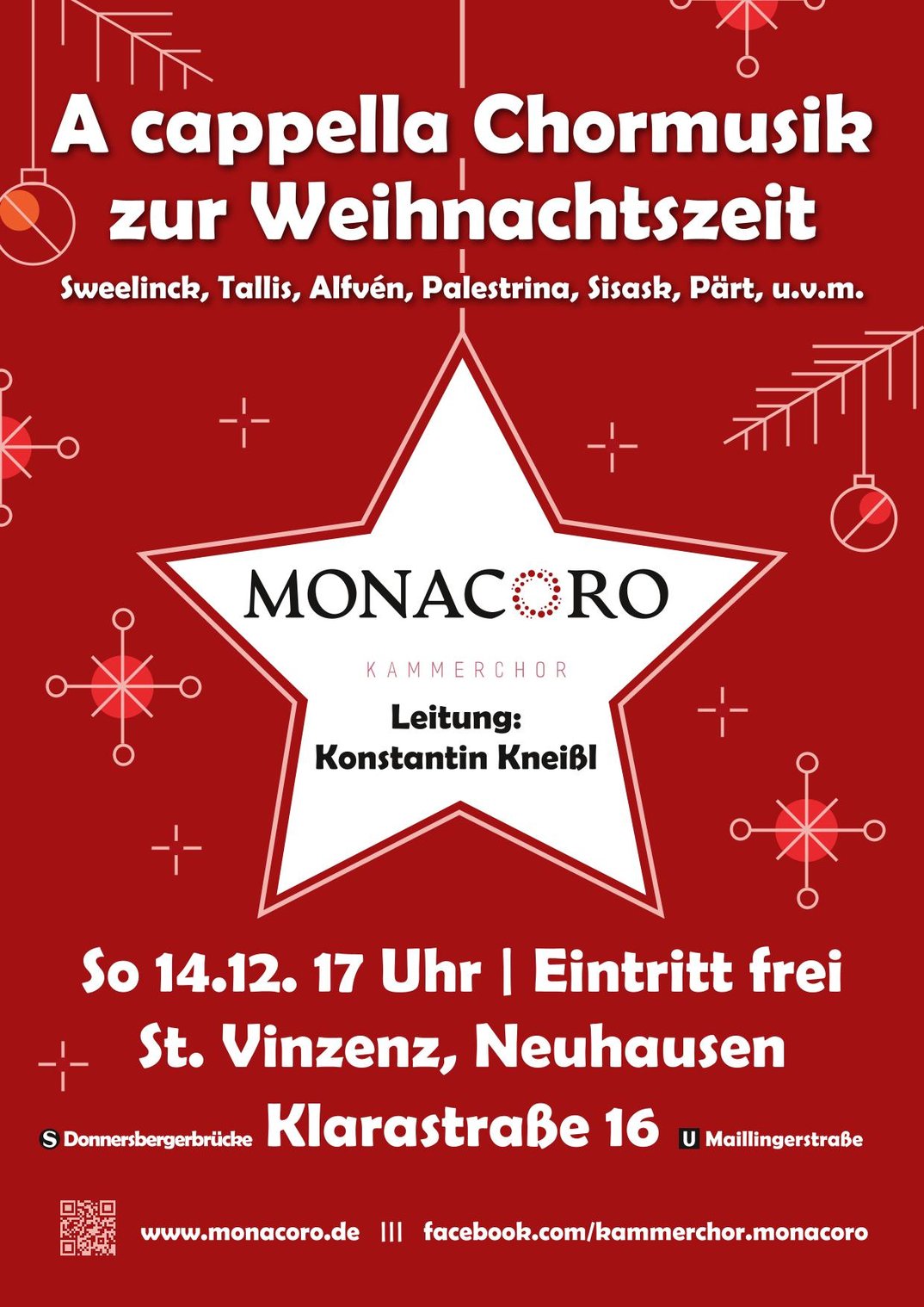 Der Kammerchor MonaCoro singt klassische A-Cappella-Chormusik von der Barockzeit bis heute, wobei der Schwerpunkt auf zeitgenössischer Musik liegt. Die magischen und besinnlichen Klänge der Komponisten wie Giovanni Pierluigi da Palestrina, Thomas Tallis, Hugo Alfven, Arvo Pärt, Urmas Sisask, u.a. werden das Publikum in ihren Bann ziehen und es auf Weihnachten einstimmen.