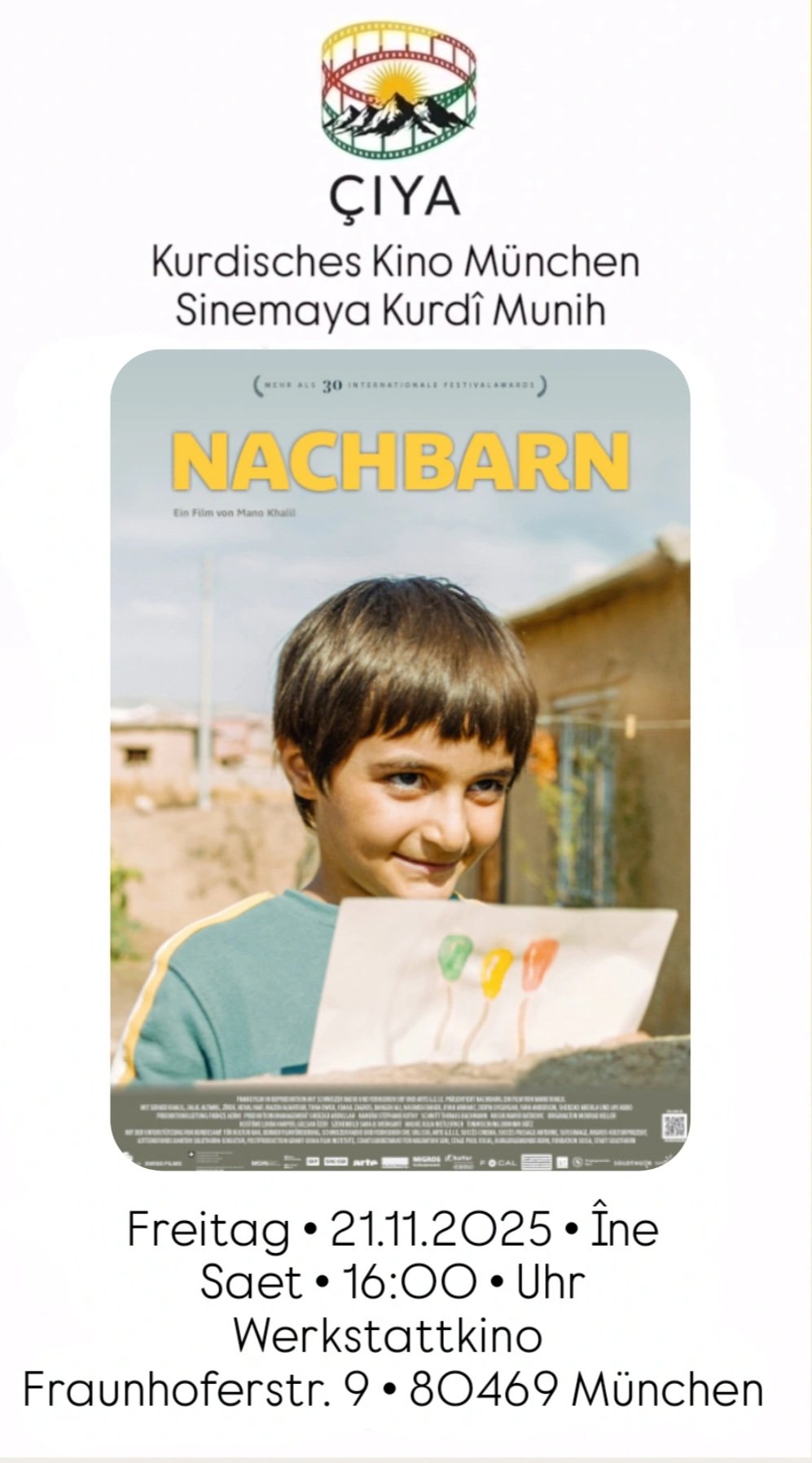 In einem kleinen syrisch-kurdischen Dorf der 1980er Jahre erlebt ein Junge, wie politische Propaganda und Unterdrückung das friedliche Zusammenleben zerstören. Nachbarn (2021, Regie: Mano Khalil) verbindet autobiografische Erinnerungen mit feinem Humor und zeigt eindrücklich, wie Menschlichkeit und Freundschaft selbst in Zeiten der Angst bestehen können.