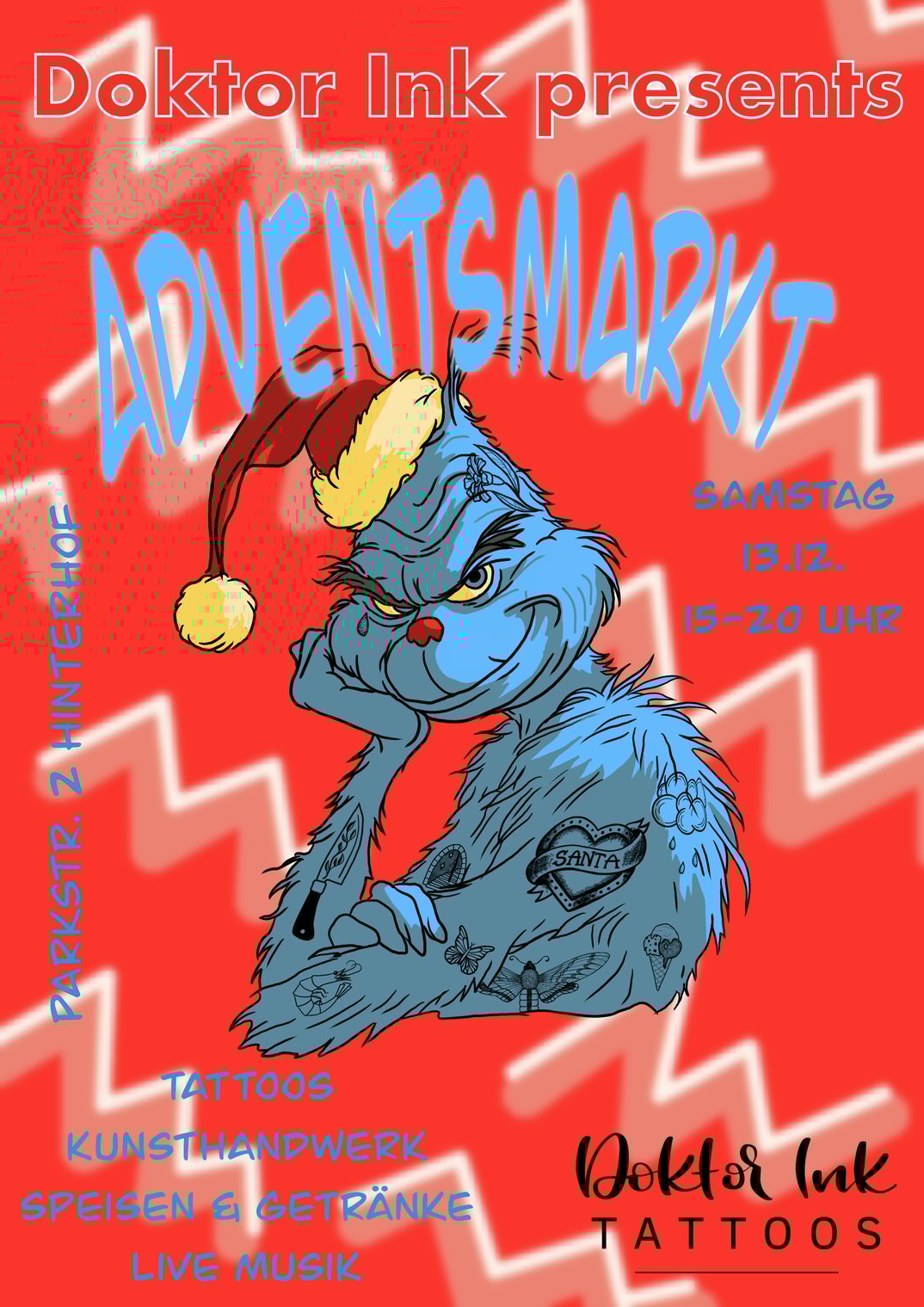 Am 13.12. lädt die Crew von Tattoo Studio Doktor Ink (Instagram @studio_doktor_ink) zum Adventsmarkt mit Tattooflash, Kunsthandwerk, Speisen & Getränken und Livemusik!