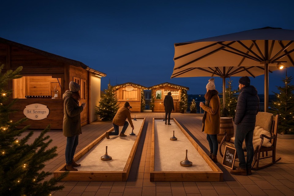 Die Dachterrasse Cloud 6 wird im Winter zur Erlebnisfläche: Mieten Sie exklusiv eine unserer Eisstockbahnen für gesellige Runden mit Freunden oder Kollegen.