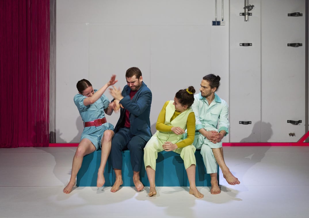 Tanztheater von Ceren Oran. R: Oran. Mit David Campling, Janosch Fries, Lucia Schierenbeck, Annelie Straub. »Stopp! Bis hierher und nicht weiter«. Über ein großes Gefühl und den Umgang mit eigenen und fremden Grenzen (ab 4 J.).