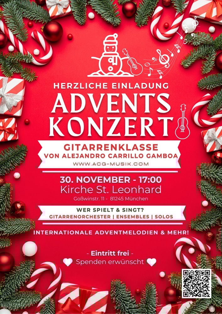 Auch in diesem Jahr lädt die Gitarrenklasse von Alejandro Carrillo Gamboa zu zwei besonderen Adventskonzerten ein:
