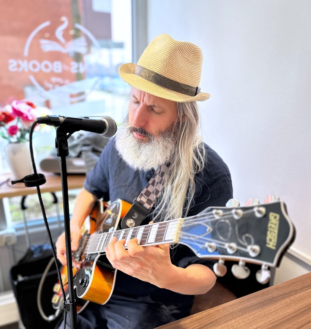 Boris Ruge ist der RESIDENT MUSICIAN im Café Beans & Books. Boris Ruge: gleich nebenan in Milbertshofen groß geworden. Heute ein etablierter Blues-Profi.