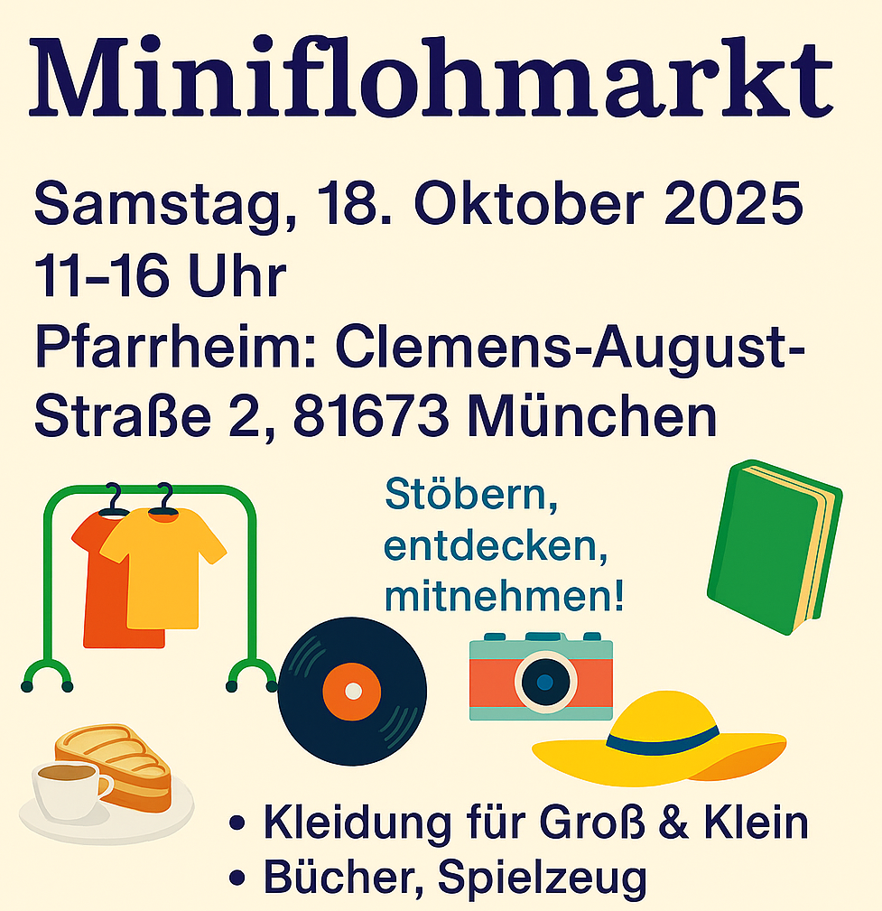 Am Samstag, 18. Oktober, laden die Ministrantinnen und Ministranten von St. Michael Berg am Laim zum großen Basar ins Pfarrheim ein: Verkauft werden Kleidung, Bücher und Spiele für Kinder und Erwachsene, dazu gibt es Kaffee und Kuchen. Der Erlös wird für einen guten Zweck gespendet. Kommen Sie vorbei und stöbern Sie mit – bestimmt finden Sie etwas, das Ihnen Freude macht, und tun damit zugleich Gutes!