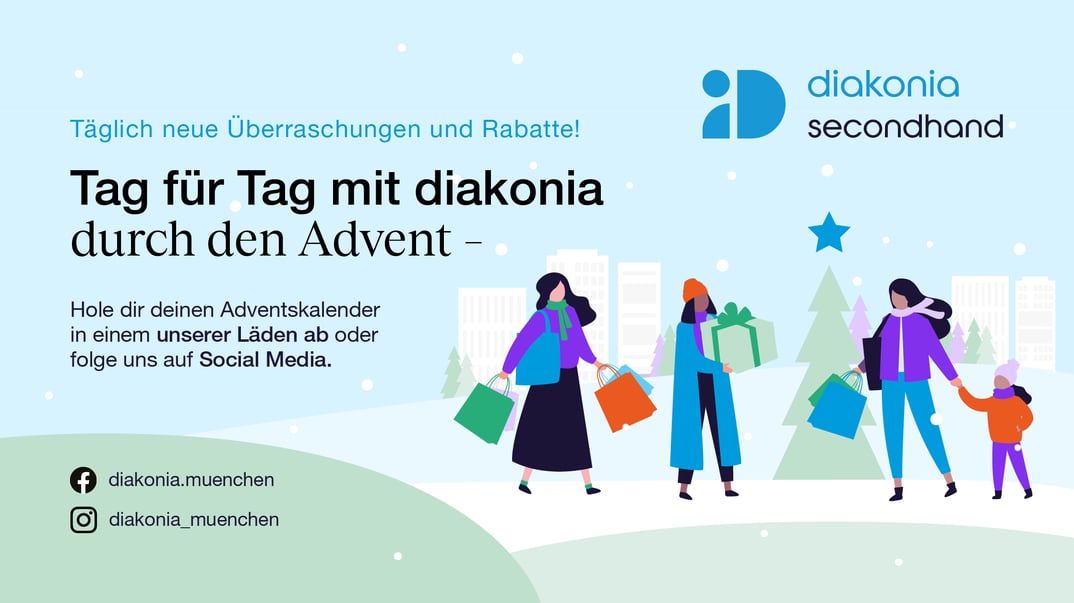 Vom 1. bis 24. Dezember verwandeln sich alle diakonia Secondhand-Läden in München und Umgebung in einen lebendigen Adventskalender: Hinter jedem „Türchen“ steckt eine neue Aktion, ein besonderer Rabatt oder eine kleine Überraschung. Einfach vorbeischauen, mitmachen und entdecken – oder den Advent online mitverfolgen: Auf den Social-Media-Kanälen von diakonia gibt es täglich die aktuellen Angebote und Rabatte zu sehen.