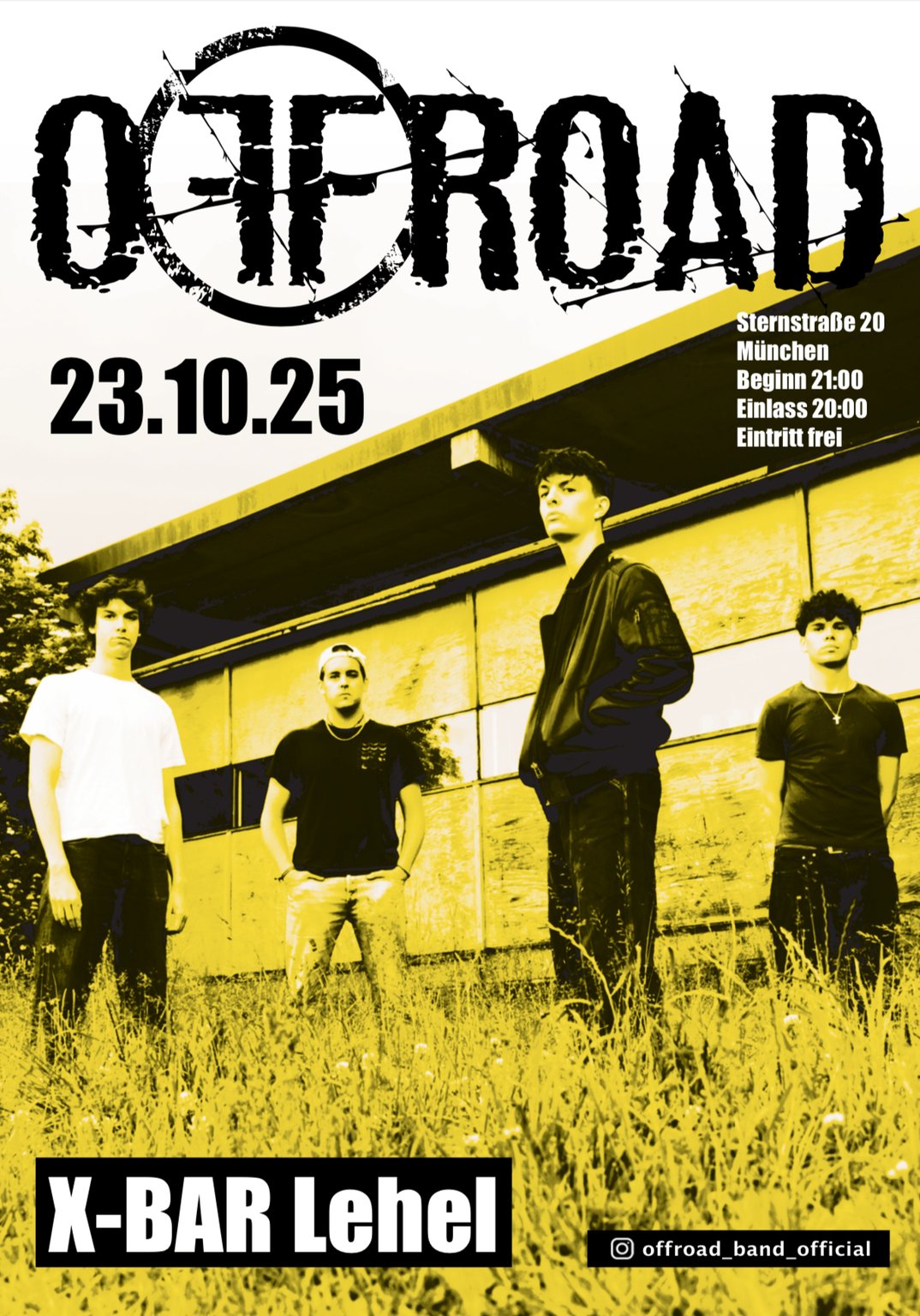 Hart, ehrlich und mit voller Wucht: Offroad bringen ihren Mix aus Rock, Rap und Metal auf die Bühne der X-Bar! Die vier Jungs aus Starnberg – Alois, Paul, Julius und Raphael – liefern rohe Energie, fette Riffs und ehrliche Texte, die direkt treffen.