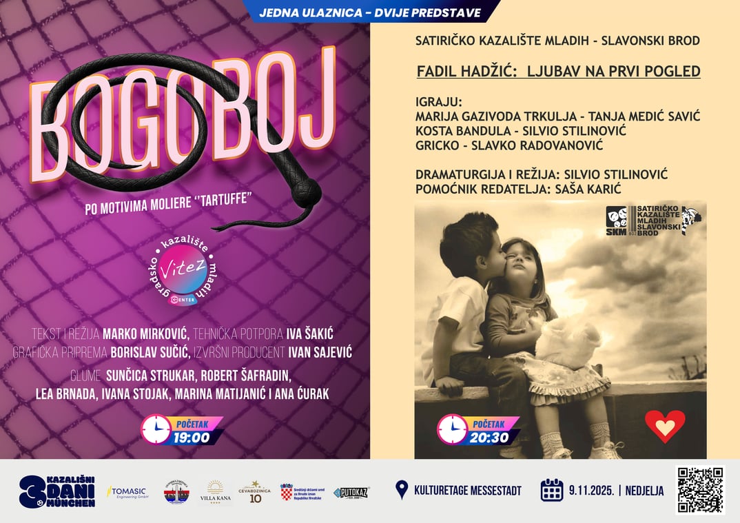 Das MASKA Theater setzt seine Festivaltradition fort – die III. Münchner Theatertage stehen vor der Tür ! Der dritte Abend folgt am 9. November in der Kultur-Etage Messestadt. Zu Gast sind das dem Publikum bereits bekannte Städtische Jugendtheater Vitez und das Satirische Jugendtheater Slavonski Brod, die sich erstmals dem Münchner Publikum präsentieren. Diese Kombination aus heimischem und Gastprogramm bietet den Zuschauern die einmalige Gelegenheit, neue Theatererlebnisse zu entdecken.