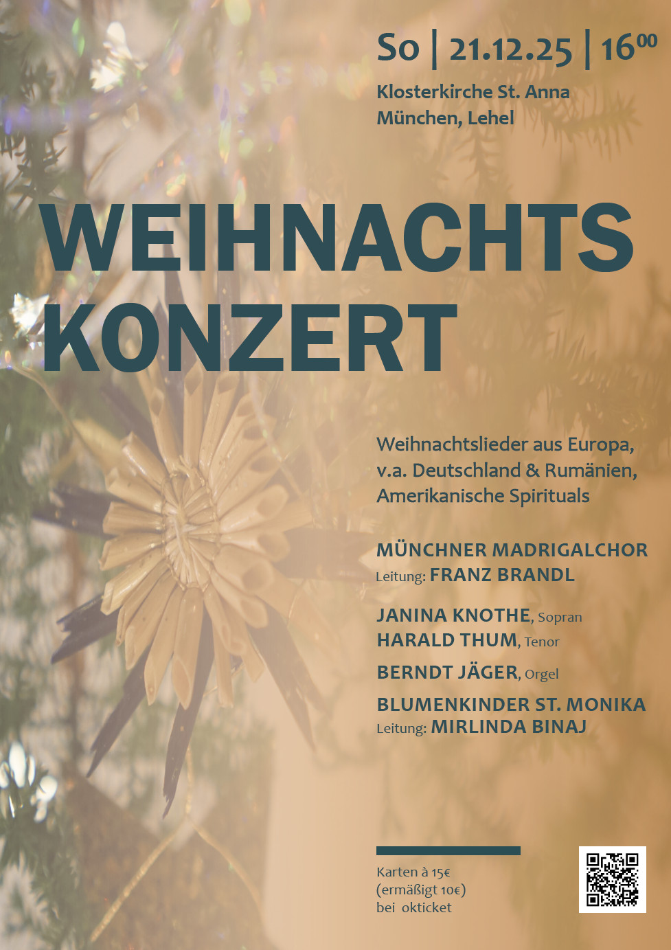 Mit einem besinnlichen und freudigem Weihnachtskonzert nimmt der Münchner Madrigalchor, unter der Leitung von Franz Brandl, die Zuhörer in die Klangwelt europäischer Weihnachtslieder mit. Deutsche, rumänische und spanische Musik wird von amerikanischen Spirituals bereichert. So entfaltet sich eine beeindruckende stilistische Vielfalt, die das Konzert zu einem lebendigen, farbigen Erlebnis werden lassen. Dazu tragen auch die vielen Mitwirkenden bei: der Münchner Madrigalchor, die Blumenkinder Sankt Monika unter Leitung von Mirlinda Binaj, Berndt Jäger an der Orgel und Janina Knothe sowie Harald Thum als Solisten.