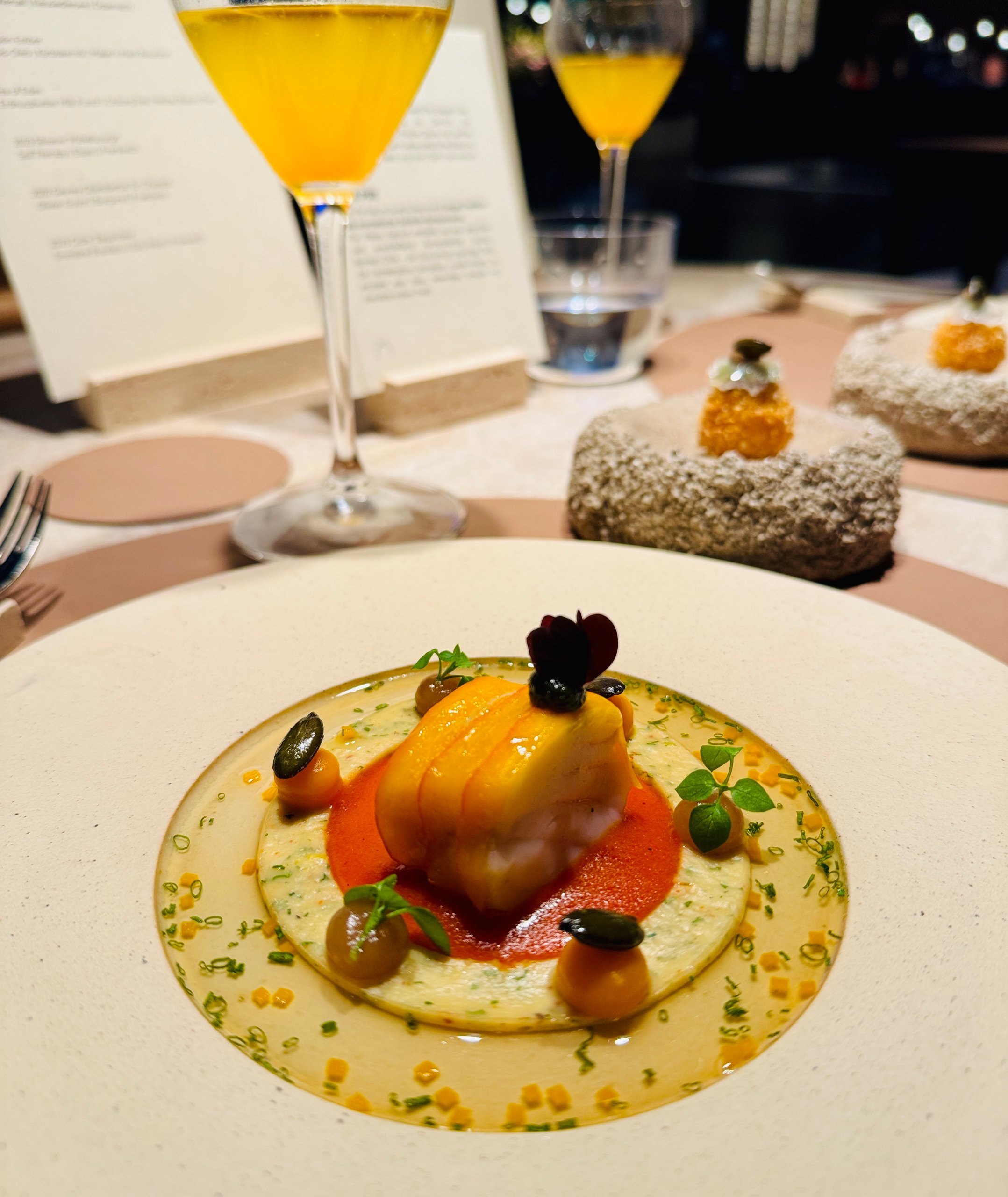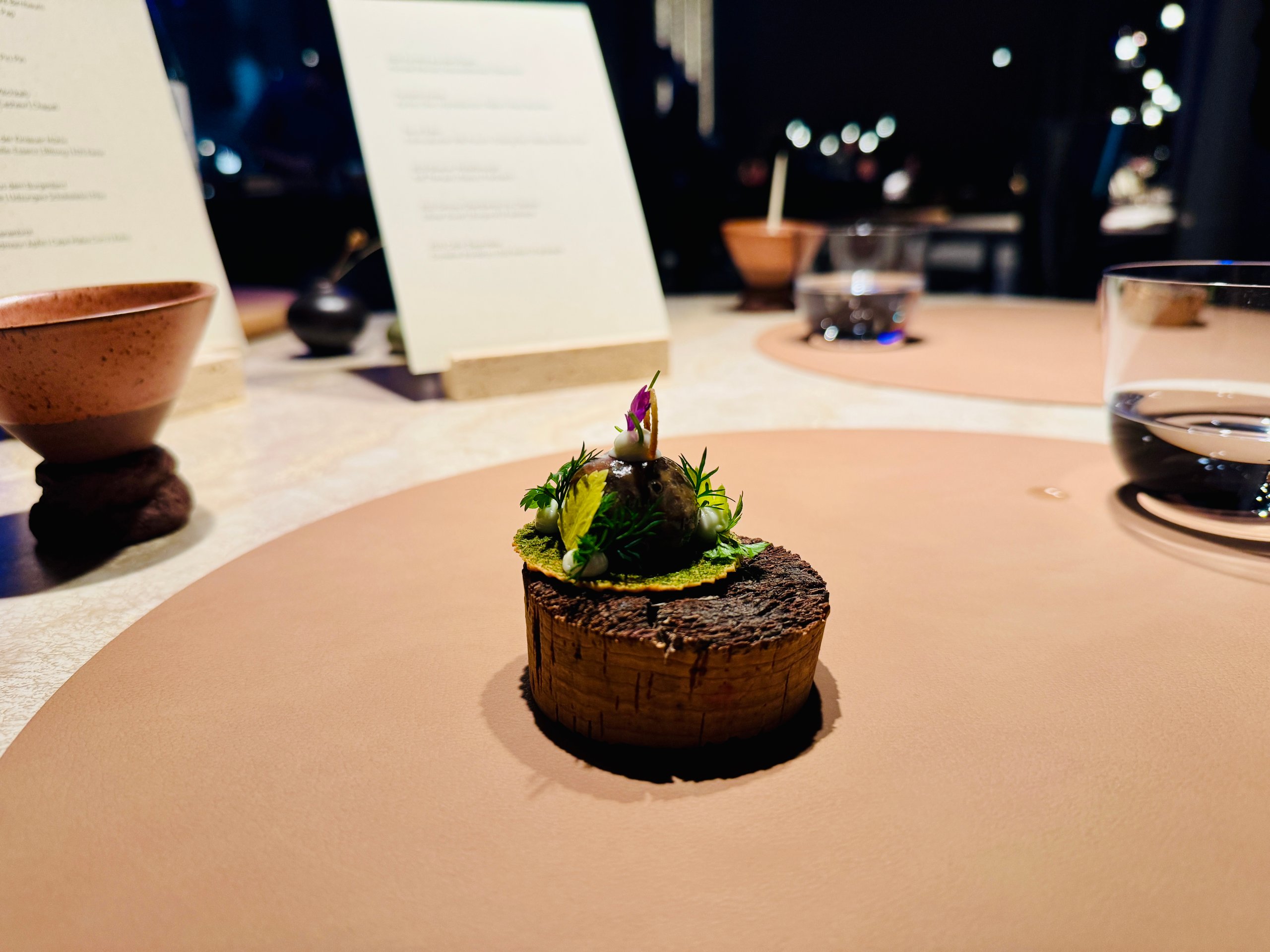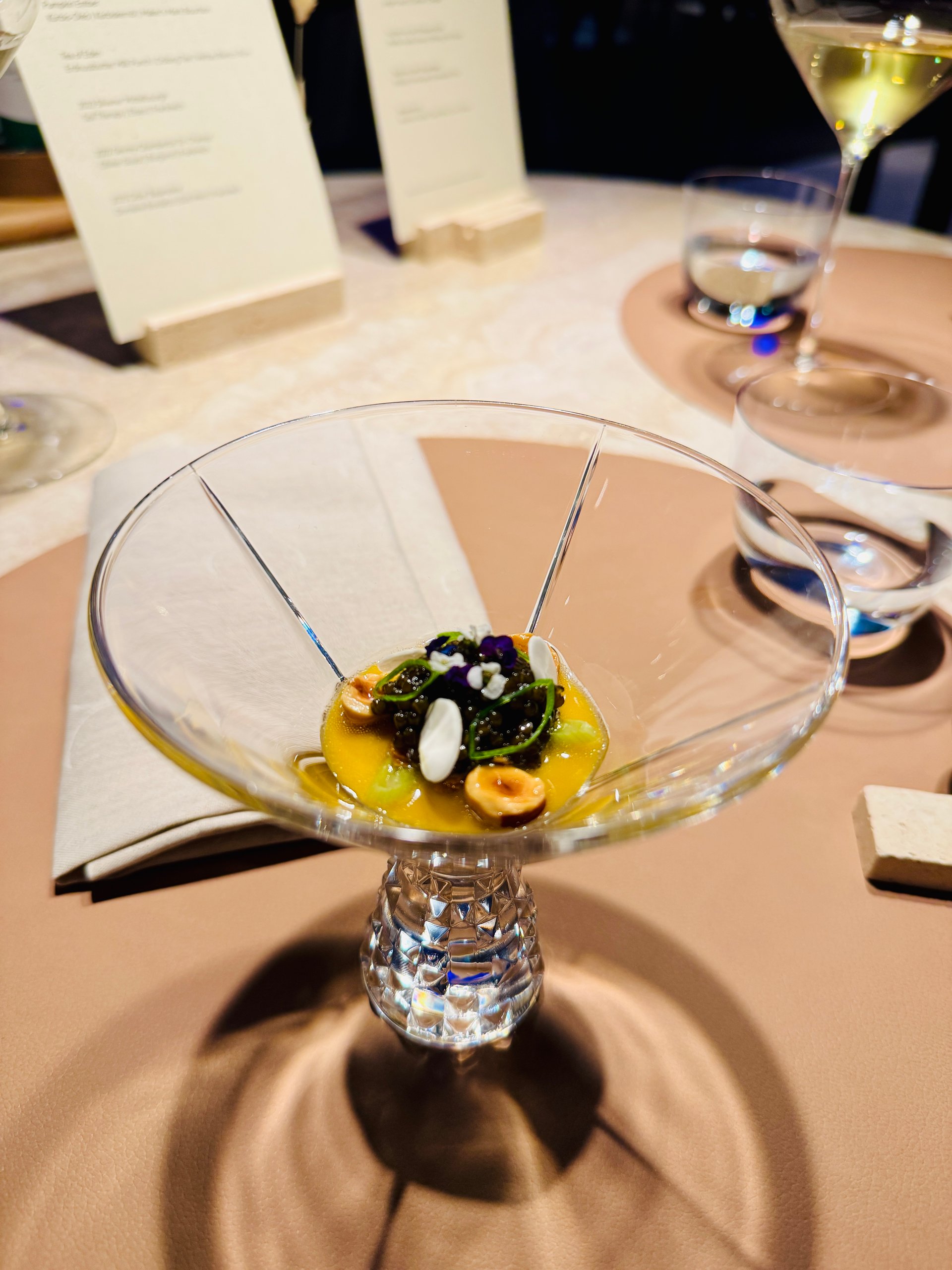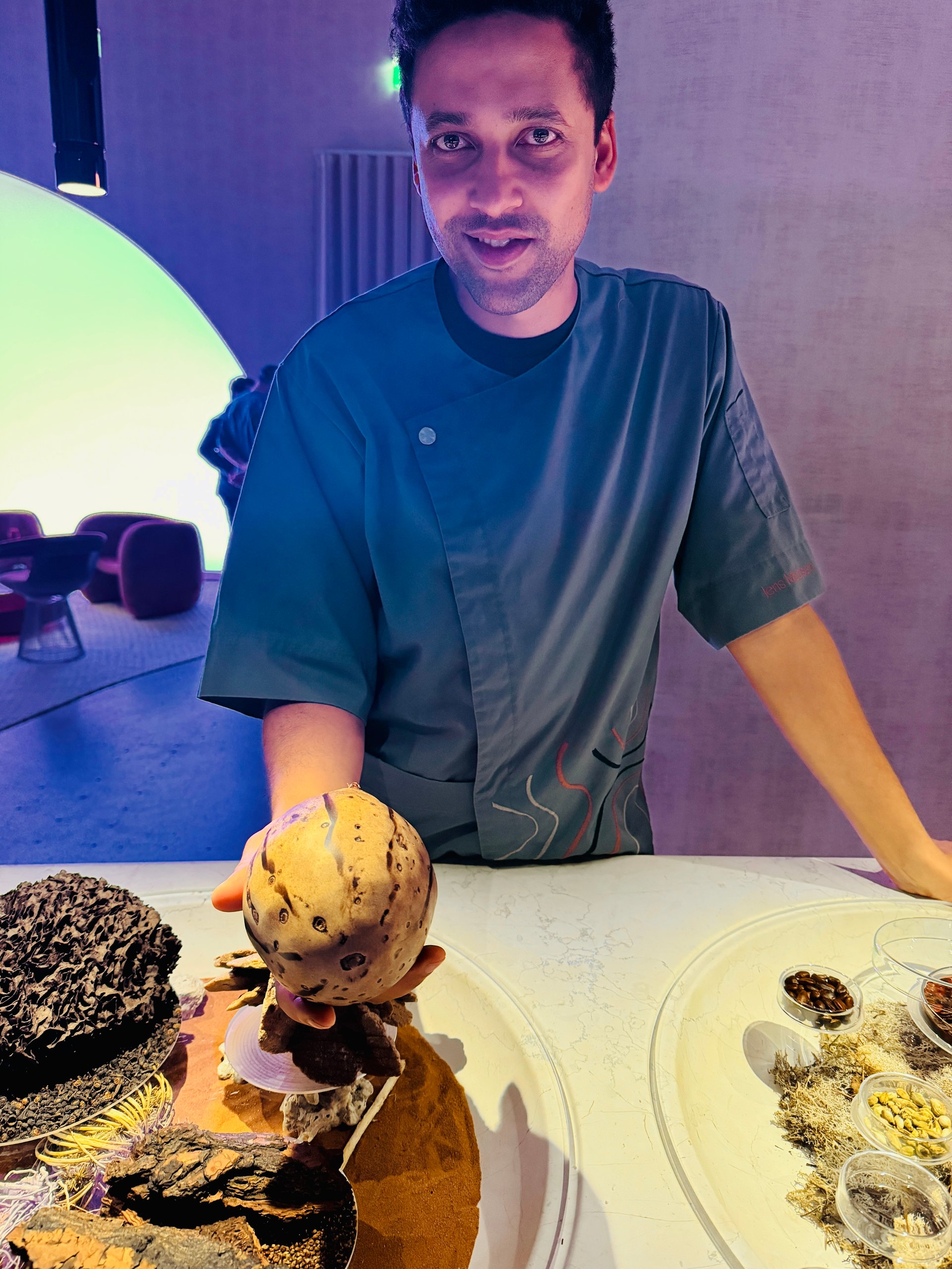 Nach einer kurzen Einführung von Restaurantleiterin Mona Röthig erzählt Jens Madsen an einer Biophilie-Bar von seinen Gewürzentdeckungen auf den Straßen Ost- und Südafrikas oder Sansibars: Baobab als Bindemittel, Sandelholz-Raspel-Tee, Voatsiperifery-Pfeffer aus Madagaskar. Im Geist flimmert die Luft, rotstaubige Straßen tauchen auf, irgendwo rauscht die Brandung. Und weiter geht’s ins Raumschiff mit den nächsten Grüßen aus der Küche: fantasievolle, teils winzige Kreationen aus Limetten-Ingwer-Baiser, Schwarztee-Creme, Osietra-Kaviar (N25), Lauchmus und Zuckerwatte; Okra-Brokkolisalat mit Muskatblütenschaum und Kaffir-Limetten-Abrieb; Erdmandelpudding mit Shiso-Vinaigrette, Frühlauch, Haselnüssen und Beluga-Kaviar. Kulinarische Kleinkunstwerke – köstlich und doch nur ein Vorgeschmack auf das, was noch folgen sollte.