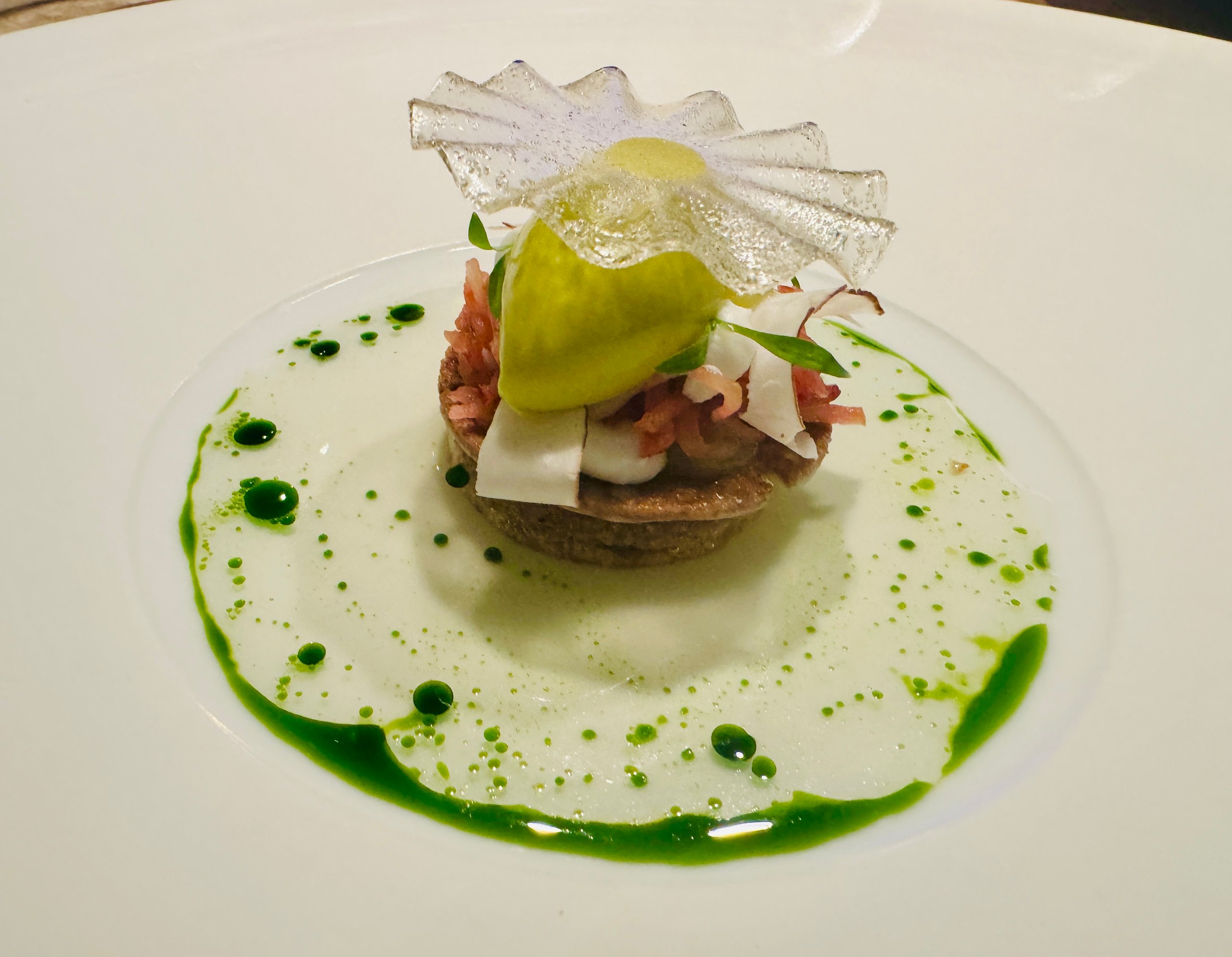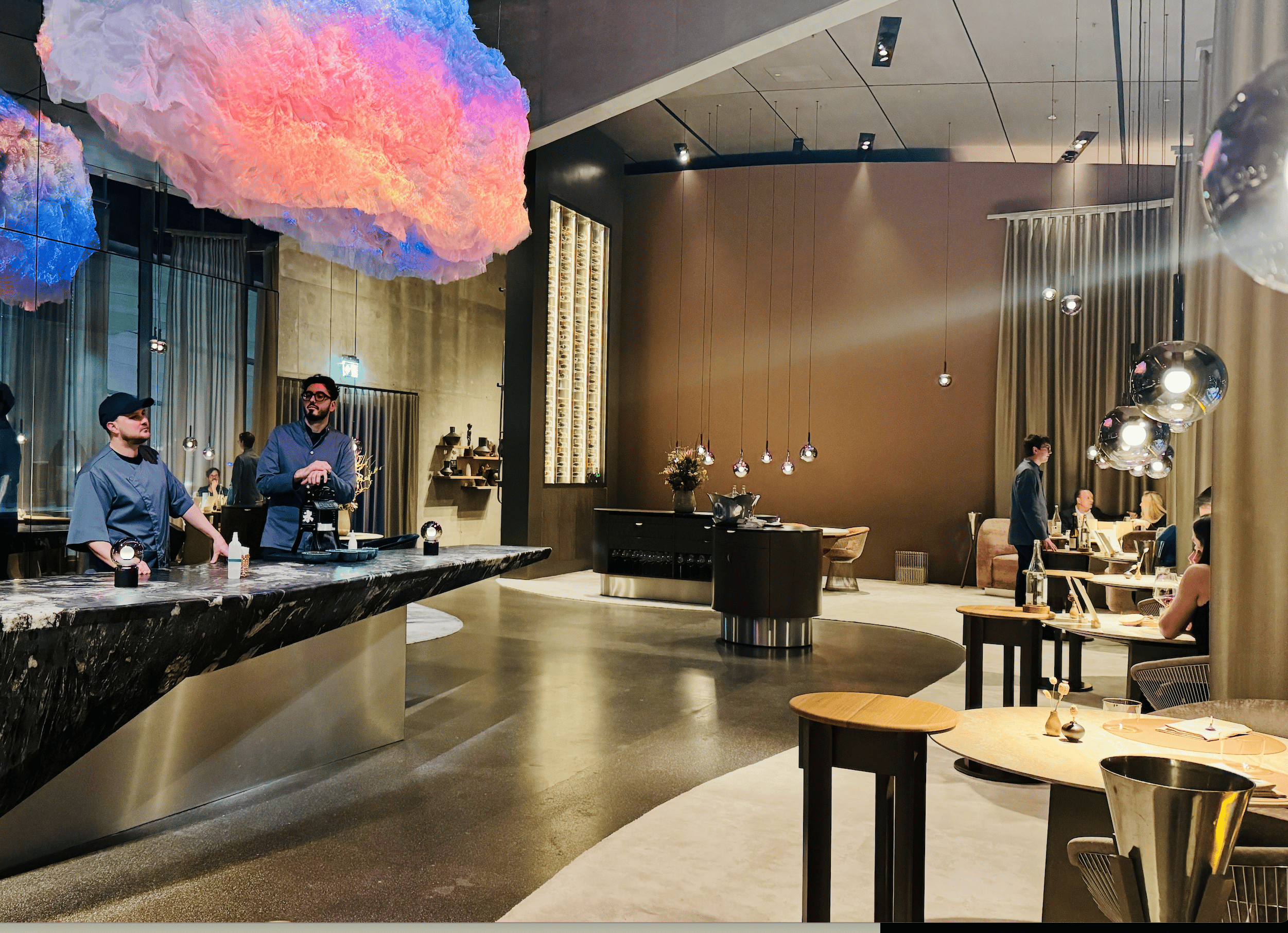 Das neu designte Restaurant ist beeindruckend – man schwebt im dritten Stock über den zu Matchboxautos geschrumpften Boliden der BMW Welt; zum Glück holt gerade niemand zu „Final Countdown“ seinen neuen 3er, 5er oder iX3 ab. Im großzügig um einen massiven Monolithen, der als Anrichte fungiert, bestuhlten Raum schwebt die namensgebende Wolke in langsam wechselnden Farbtönen – so oder so ähnlich haben sich Futuristen wie Philip K. Dick wohl ein Sterne-Restaurant im All vorgestellt. Die Musik dazu ist stimmig: der Bass von Khruangbins Laura Lee sorgt für ein wohliges Pendant zum fruchtigen Hibiskus-Chai als Apero und einer Burgunder-Cuvée von Christmann & Kaufmann. Als erstes Amuse gueule wird dazu ein krosses Teigschälchen mit ostafrikanischer Spinatkreation, schwarzem Knoblauch, Pekannuss und Essigkraut gereicht – eine erste unerwartete und willkommene Geschmacksexplosion.