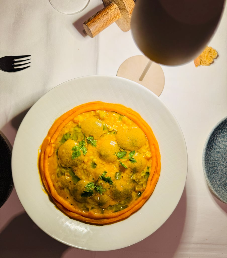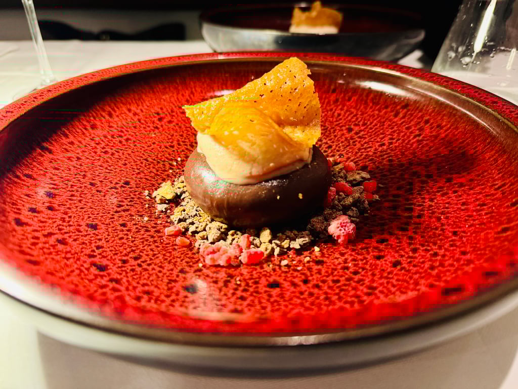 Danach Geschmacksexplosion numero due: Zu einem frischen 2024er Chardonnay „Mej“ von Romano Dogliotti aus dem Piemont wurde ein Kürbisrisotto mit roten Garnelen und Hummer-Bisque serviert. Ganz ehrlich: Das wohl cremigste und auf dem Reiskornpunkt bestens gegarte Risotto, das in letzter Zeit gegessen wurde. Die Bisque gibt dem Kürbis Pfiff, die bissfesten Garnelen, von ähnlicher Qualität wie der Thun, gingen trotzdem nicht unter.