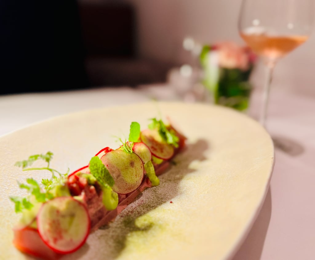 Nach einem besten balancierten (Perlage-Dosage) Brut Rosé von Pojer e Sandri aus dem Trentino, ging es los mit einem Gruß aus der Küche: Ein Löffel köstlichstes Ragout Genovese wurde auf einem Parmesanteigbällchen angerichtet – Geschmacksexplosion numero uno. Die Vorspeise „Thunfisch, russischer Salat, Radieschen“ entpuppte sich als erster Ausflug in die höhere Gastrosphäre – Tranchen vom Thun bester Qualität, die man in München bekommen kann (Autor war gerade in Japan und weiß, wovon er schreibt), wurden mit einem Salat aus Radieschen-Brunoise, einer Petersilien-Mayonnaise und etwas Radieschen-Scheibchen, Dill und Minzblättchen getoppt.