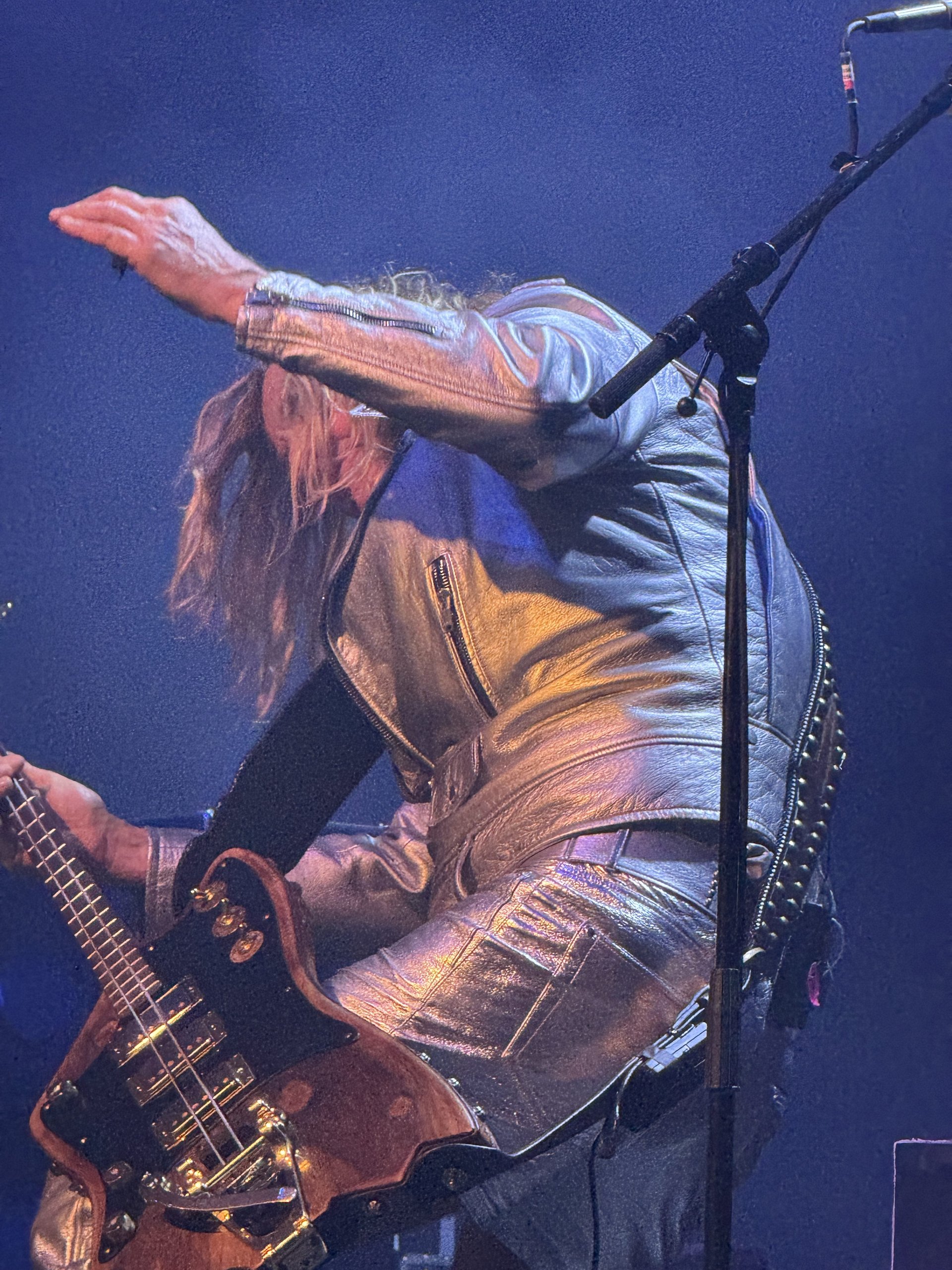 Jesper bei bester Stimme, seine launischen Ansagen in Deutsch, die Flying V im Anschlag – hier ist der geborene Rockstar am Werk, und das wie gesagt seit 40 Jahren. Bruder Jacob bearbeitete die schwarze SG wie der kleine Wizzard aus Australien, der hier den ein oder anderen Riff entliehen hat, der „neue“ Schlagzeuger Laust Sonne (seit 1999) legte das Fundament, auf dem Stig Pedersen mit seinen zweisaitigen, in witzigen Body-Shapes gebastelten Bässen in seinem silbernen Space-Drag-Glam-Outfit den Groove bestimmte.