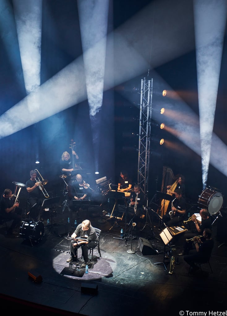 Es geht weit über eine reine Lesung hinaus. Wir stehen da zu elft auf der Bühne – zehn Musiker und ein Sprecher. Man könnte auch sagen: ein Konzert für elf Stimmen. Ein Hybrid also, aber für mich immer ein Theaterabend.
