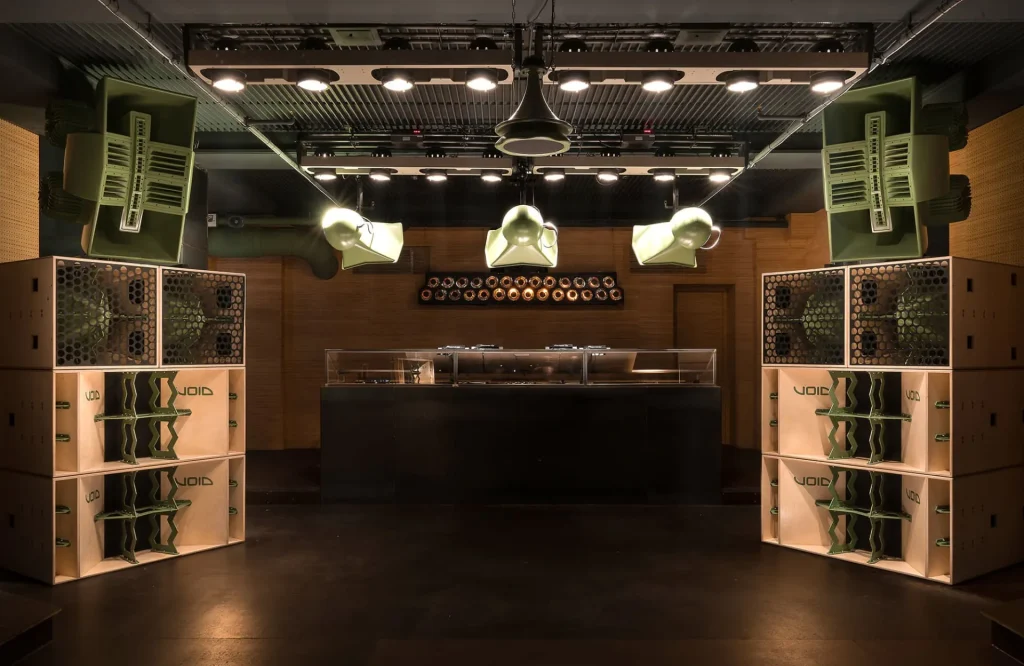 Mit rund 600 Quadratmetern nimmt der Dance- und Elektroclub etwa die Hälfte des Erdgeschosses und bietet gleich zwei Dancefloors für die Clubgänger. Besonders bekannt ist der Club für sein kompromissloses VOID-Soundsystem, das speziell für den Raum entwickelt wurde, einen klaren, druckvollen Klang bietet und Clubgänger mit der Zunge schnalzen lässt. Auch der Raum selbst wurde in enger Zusammenarbeit von Innenarchitekten und Sound-Designern entworfen. Dabei wurden rechte Winkel wurden bewußt vermieden und Stahlblech als Baumaterial verwendet. Umlaufend sinn die Wandflächen mit einem Relief aus schwarz lackierten, stark strukturierten MDF-Platten verkleidet. Das speziell für diesen Raum entwickelte Muster aus Vertiefungen und Erhebungen basiert auf Algorithmen und wiederholt sich an keiner Stelle.