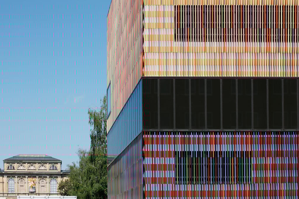 - Architektonisches Highlight: Farbenfrohe Fassade aus 36.000 keramischen Stäben