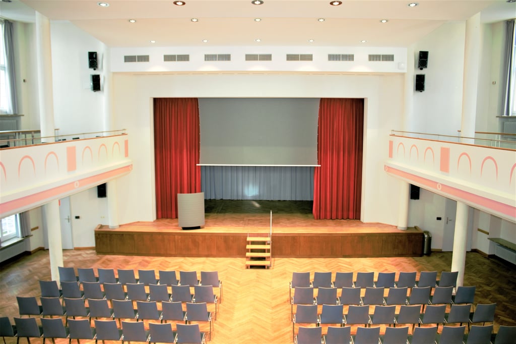 Unser Prunkstück ist der Festsaal mit 500 m² auf zwei Ebenen, für bis zu 450 Personen – ideal für Veranstaltungen aller Art. Der Saal hat schon alles beherbergt: von Messen bis Theateraufführungen, über internationale E-Sports-Turniere bis hin zu hochoffiziellen Versammlungen der Stadt, der Politik oder großer und kleiner Unternehmen.