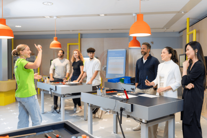 - Workshop-Infrastruktur mit höhenverstellbaren Werk- und Partytischen.