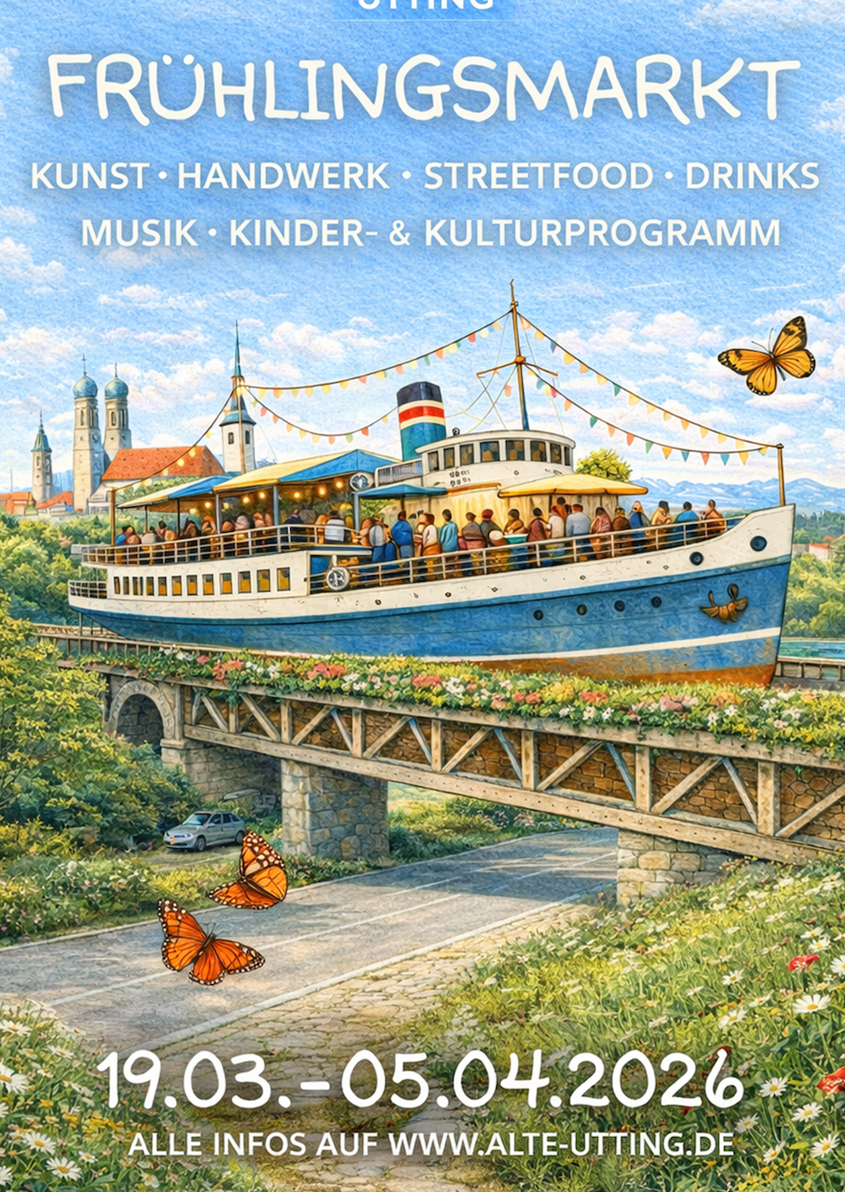 Ab Mitte März heißt es erstmals: Leinen los für den Frühlingsmarkt auf der Alte Utting. Auf dem ausrangierten Ausflugsschiff hoch über Sendling präsentieren Aussteller*innen handgemachte Schätze, Designstücke und kleine Lieblingsdinge – alles mit viel Liebe gefertigt.