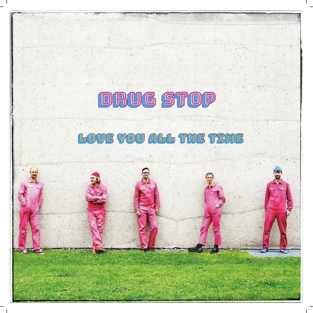 Das im Januar auf Vinyl bei Rheinschallplatten – jenem Label also, dass sich bereits mit Veröffentlichungen von Katie Smockers Wedding Party, Beißpony, Sasebo, Monobo u.a. einen ehrenwerten Namen im Münchner Underground machen konnte – erscheinende Debütalbum „Love You All The Time“ liefert alles in allem den perfekten Soundtrack für einen ausgelassenen Roadtrip. Als dann: Motor an, Mütze auf, Fenster runterkurbeln, Radio auf laut und ungeniert mitgesungen beim zwischen C86 und Twang changierenden Gitarrenschrammel von „57 Years“, dem elegant-lässigen Northern-Soul-Vibe von „Cutting Crew“, einer Hommage an die gleichnamige britisch-kanadische 80s-One-Hit-Wonder-Band („(I Just) Died in Your Arms“) oder der ebenso hypnotischen wie unwiderstehlichen Slacker-Hymne „Heaven“. Der Titelsong umarmt die Hörenden mit filigran geschichteten (Gitarren-)Melodien á la Tom Petty, während das Saxophon in „(You Got The) Money“ mächtig aufs Gaspedal tritt. Schwermütig schwankend dann „Garbage“, „Erase Me“ kommt intensiv und in aller Dringlichkeit daher und „Maybe I’m The Only One For Me“ verwurschtelt gekonnt Psychedelia und 70er-Krautrock. Und so ließe sich ein jeder Song von Drug Stop herausgreifen, um zu attestieren: Hier entsteht ein schwer zu fassendes Zwischenreich verschiedener Rock-Stile, das dann wiederum den ganz besonderen Reiz der fünf Münchner Musiker ausmacht.