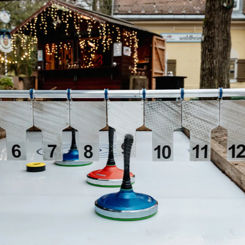 Im Waldheim-Biergarten am südwestlichen Münchner Stadtrand warten zwei 14 Meter lange Natureisbahnen auf beschwingte Hobbysportler. Ihr könnt sie täglich ab 14 Uhr bis 21 Uhr jeweils zur vollen Stunde mieten und mit bis zu 10 Personen pro Bahn spielen. Nur von Heiligabend bis 4. Januar ist kein Spielbetrieb. 45 Euro pro Stunde und Bahn kostet der eisige Spaß, die Eisstöcke sind inklusive. In der Weihnachtshütte nebenan könnt ihr euch mit Heißgetränken und Essen (z.B. Chili con Carne oder Schnitzel-Burger) versorgen.