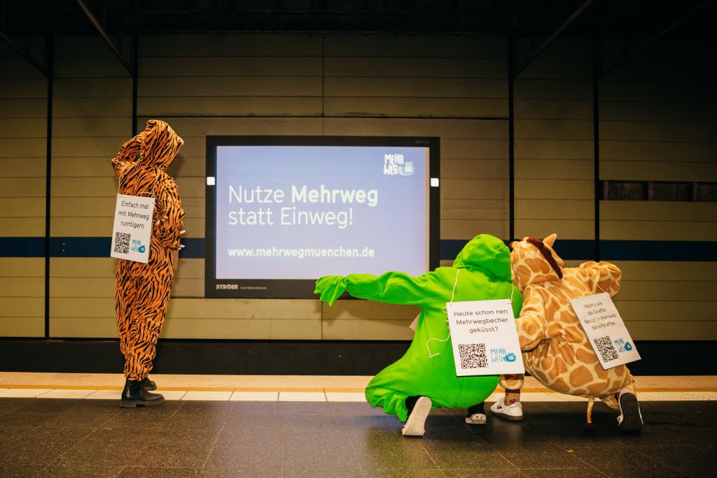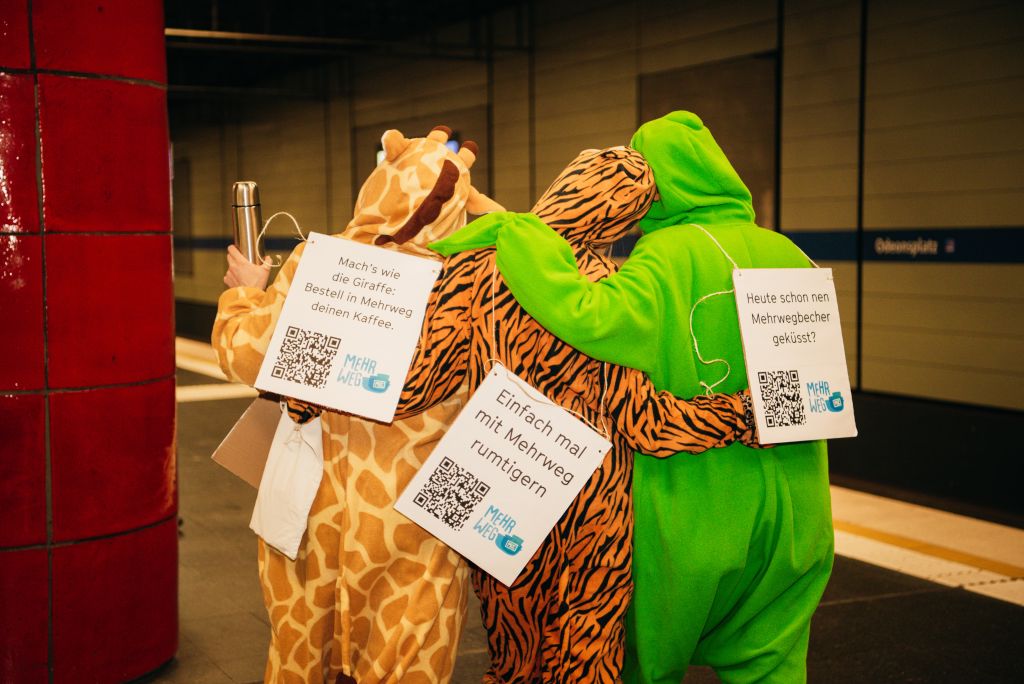 Ohne erhobenen Zeigefinger will das Münchner Kreativkollektiv Rehab Republic mit ihrer Aktion, im Rahmen des Projekts Mehrweg München, Münchner*innen auf Mehrweg aufmerksam machen. „Wie wär’s mit Kaffee aus dem eigenen Becher oder Breze aus dem Stoffbeutel? Sieht nicht nur gut aus, sondern schmeckt auch gleich viel besser! Also warum nicht einfach mal mit Mehrweg rumtigern?“ Mit solchen Fragen möchte das Team von Rehab Republic die Müncher*innen zu mehr Nachhaltigkeit im ganz normalen Alltag bringen, denn noch immer landen weit über 190.000 Einwegbecher täglich in München in öffentlichen Abfalleimern.
