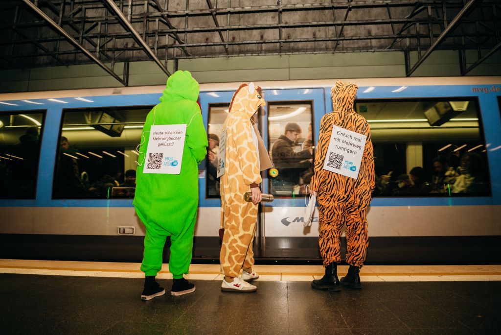 Am 29. November machen Tiger, Frosch und Giraffe von Rehab Republic die Münchner U‑Bahn unsicher. Die tierische Mehrweg München-Gang ruft zu einer Stadt ohne Einwegmüll auf.
